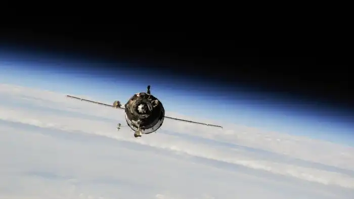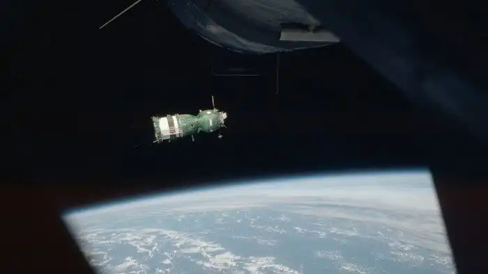 13. Международная программа "Союз-Аполлон". Космический корабль «Союз-19» в полёте. Фото с космического корабля «Аполлон-18». 15 июля 1975 года.