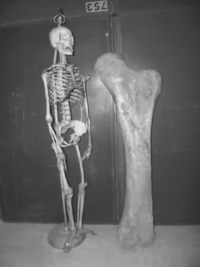 Бедренная кость ископаемого слона рядом со скелетом человека.