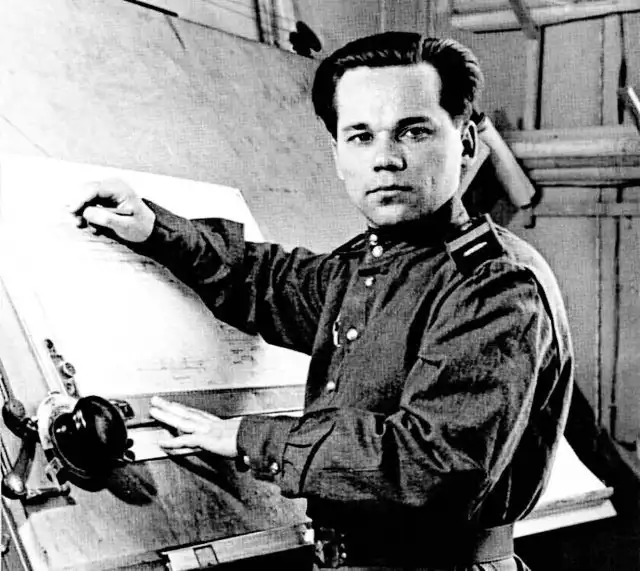 Секретарь комсомольской организации М. Калашников на фоне кульмана. СССР, 1947 год.