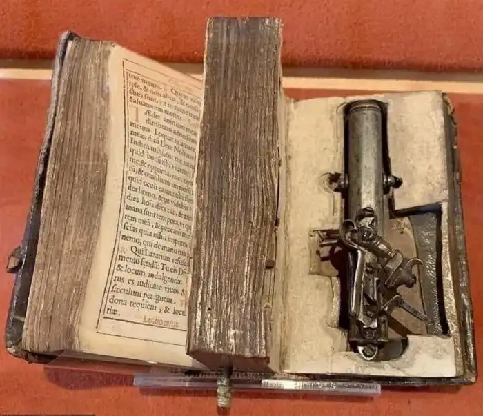 Библия из которой можно было стрелять, даже не открывая ее. Принадлежала Франческо Морозини, дож Венеции (1619–1694), хранится в Museo Correr в Венеции.