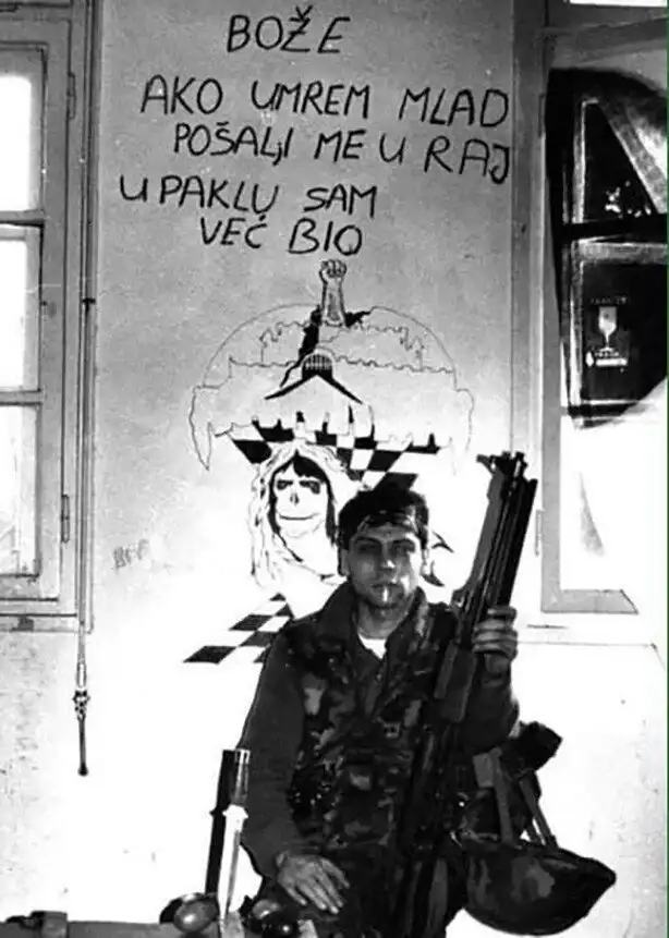 Надпись на стене: "Господь, если я умру молодым, пошли меня в рай, потому что в аду я уже был". Период войны в Югославии.