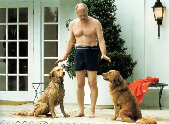 21. Президент Джеральд Форд со своей собакой Либерти и одним из ее щенков около 1976 года
