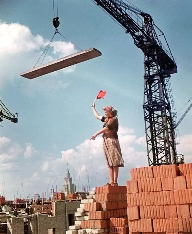 24. Строительство дома №52 на Ленинском проспекте (рядом с универмагом "Москва"). Работница строительного треста «Мосстрой №2», комсомолка А. Карнаухова во время работы на стройке. Автор – А. Моклецов. Москва. 8 июня 1957 г.
