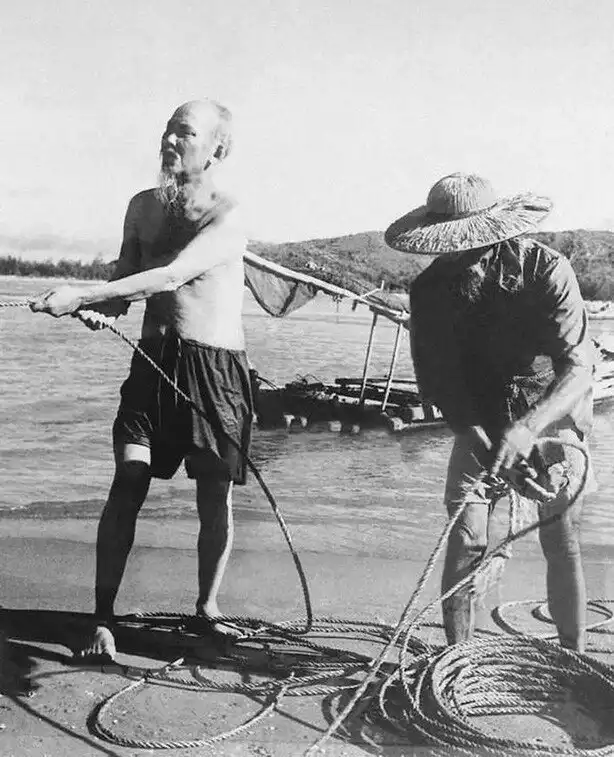 28. Хо Ши Мин, первый президент Вьетнама, тянет рыболовную сеть во время посещения рыбаков в Тханьхоа
