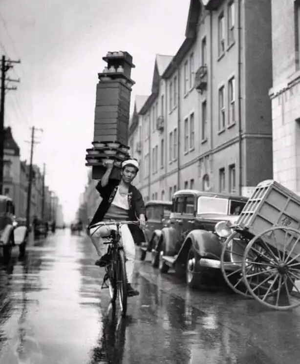 36. Развозчик гречневой лапши. Токио, 1940 г. В 1960-х гг доставка еды на велосипедах в Токио была запрещена из-за высокого риска ДТП.