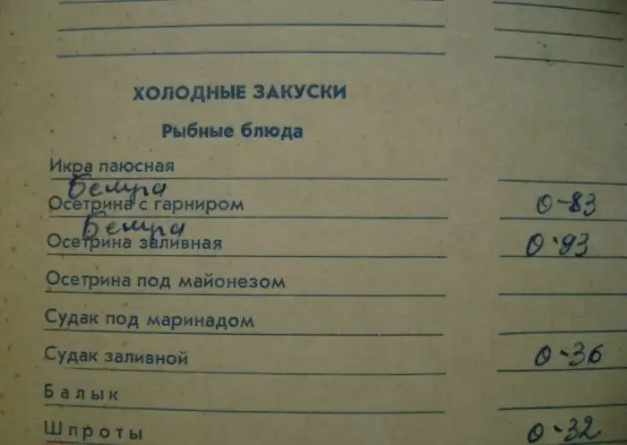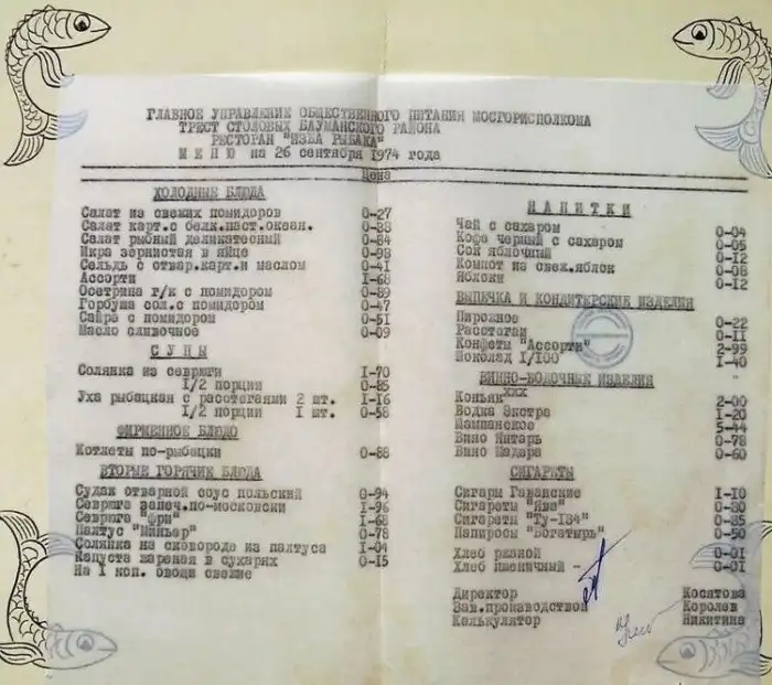 И все в таком роде - уха рыбацкая с расстегаями - 1 рубль 16 копеек, Палтус "Миньер" - 78 копеек, Осетрина горячего копчения - 89 копеек. Наслаждайтесь!