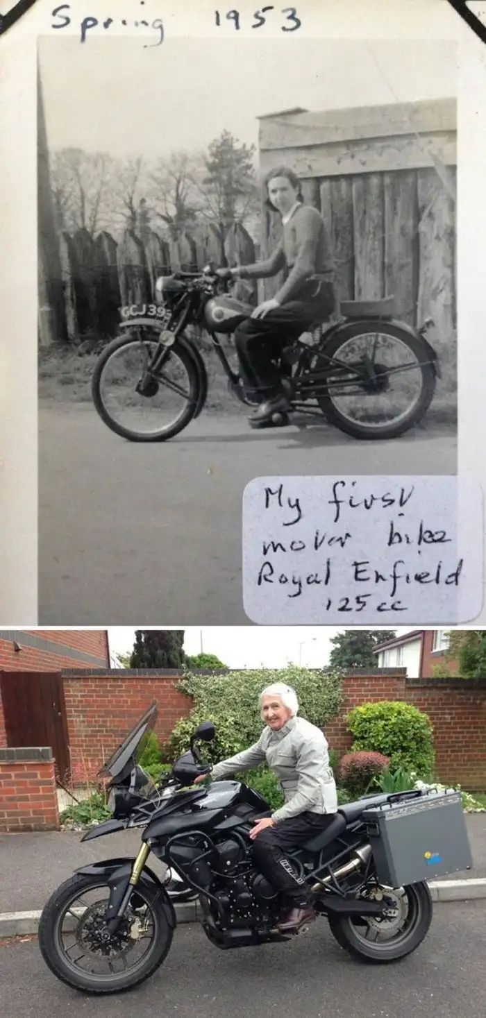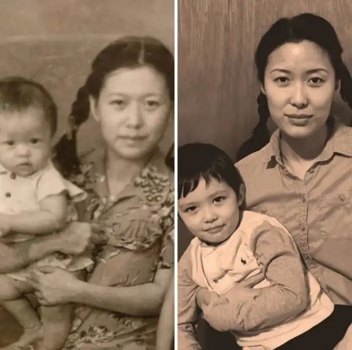 Слева бабушка женщины, держащая её отца, справа уже она сама, держащая своего собственного сына - первый снимок был сделан ровно 63 года назад