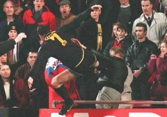 21. Футболист "Манчестер Юнайтед" Эрик Кантона бьёт в прыжке болельщика "Кристал Пэлас", 1995 год, Лондон