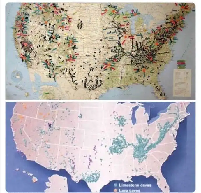 Верхняя карта показывает места бесследного исчезновения людей в США. Нижняя - карта самых ольших пещер Америки
