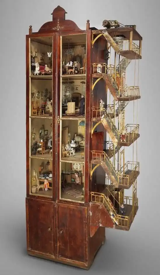 Четырехэтажный шведский кукольный домик с работающим лифтом, сделанным из металлических внутренностей часов, и электрическим освещением во всех комнатах. Сделано в 1912 году