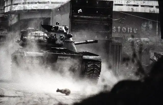 Кот перебегает через улицу во время уличного боя в Бейруте, Ливан, 1980-е