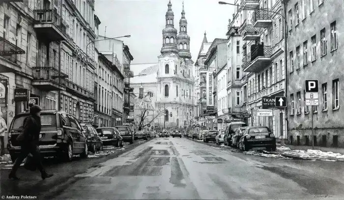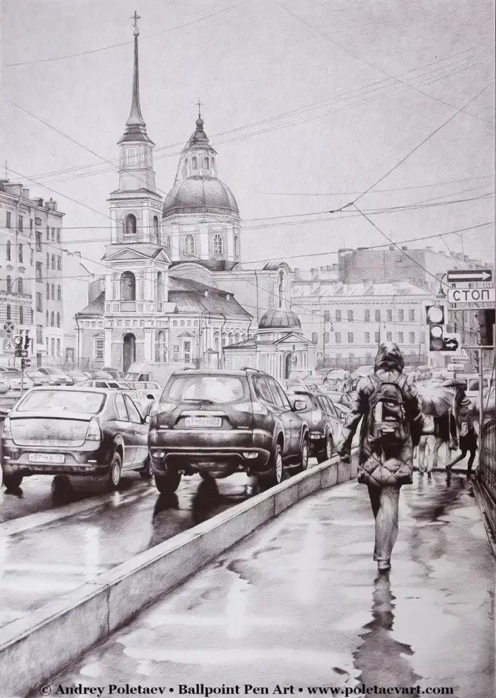 То, что когда-то было детским хобби, переросло в нескончаемую страсть и преданность городской теме. Полетаев исследовал многие области живописи, включая масло, карандаш, скульптуру и другие изобразительные техники, но рисование шариковой ручкой – это то, в чем художник действительно достиг высочайшего уровня.