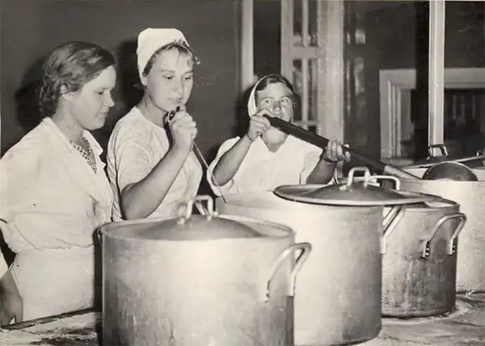 На кухне пионерского лагеря Муромского завода радиоизмерительных приборов. Неизвестный автор, 1961 год, Владимирская обл.