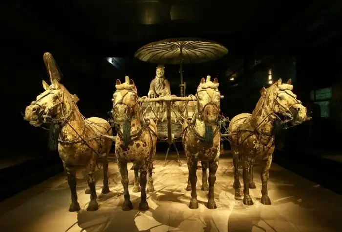 Часть армии поднята на поверхность и хранится в специальном музее.Кроме глиняных статуй в 1980 году были обнаружены две полноразмерные бронзовые колесницы. Каждая запряжена четверкой лошадей, а сбруя украшена золотом и драгоценными камнями.