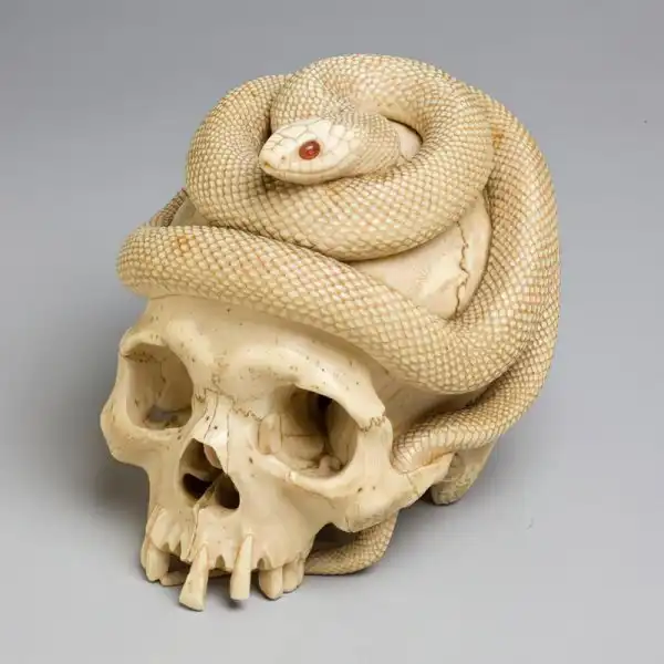 Вырезанные из слоновой кости череп и змея с глазами из драгоценного камня сердолика. Япония, период Эдо, 1860 год