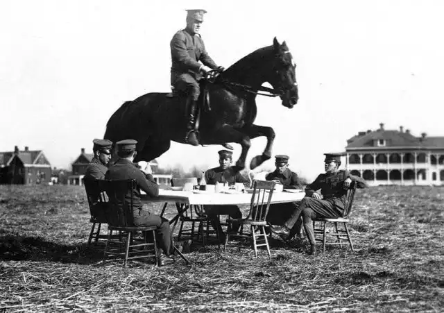 Американский офицер на лошади совершает прыжок через стол, за которым спокойно и небрежно сидят его сослуживцы.