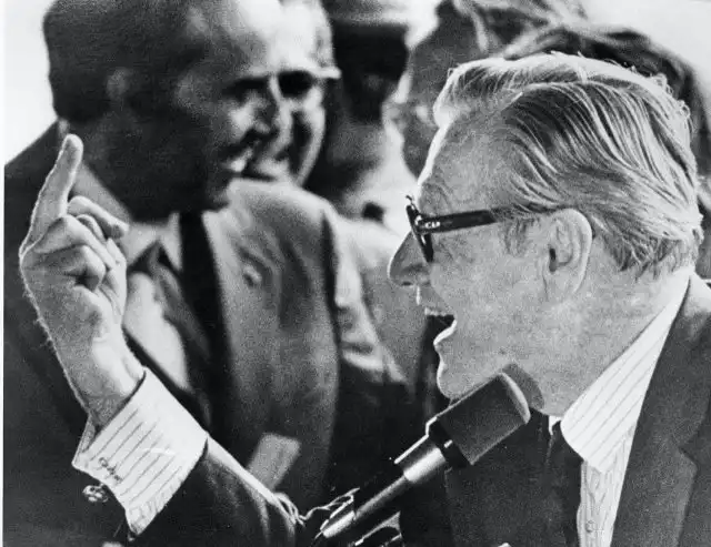 Вице-президент США Нельсон Олдрич Рокфеллер показывает средний палец толпе хиппи во время одной из публичных речей, Нью-Йорк, США, 16 сентября 1976 года.