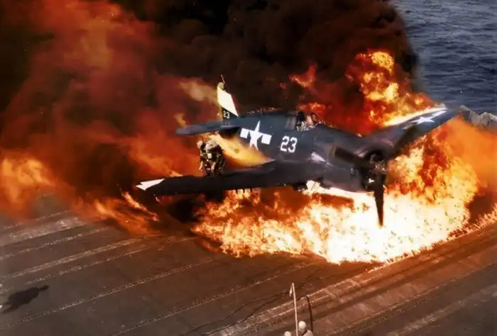 14. Пилот Энсин Ардон Ректор Айвз спасается со своего F6F-5 Hellcat на борту авианосца Лексингтон, 25 февраля 1945 года.