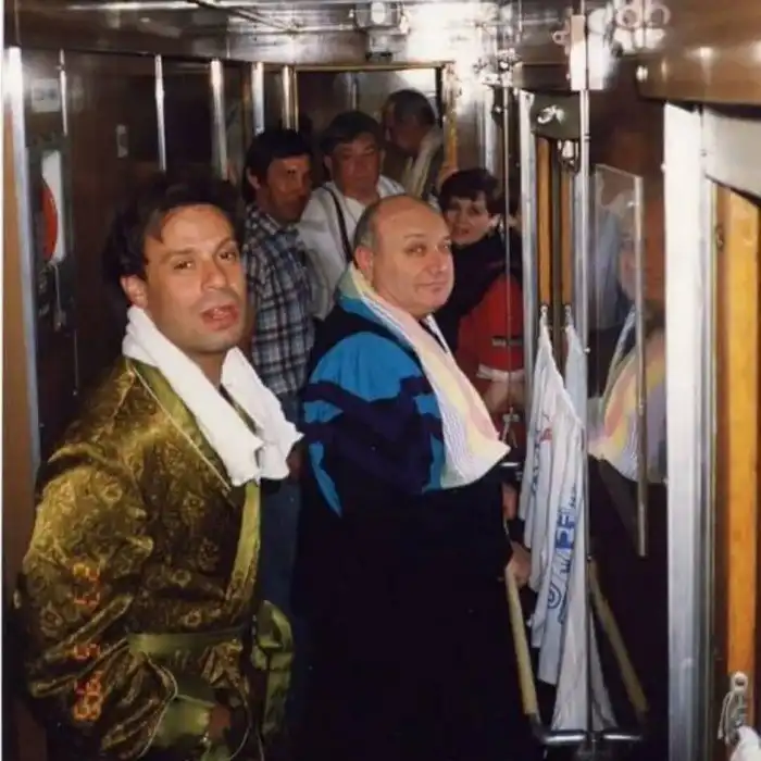 Ефим Шифрин, Михаил Жванецкий, Евгений Весник, Клара Новикова и другие стоят в очереди к туалету пассажирского вагона.