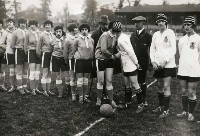 5. Капитаны женских сборных по футболу Англии и Франции приветствуют друг друга перед началом матча, Лондон, 1925 г.