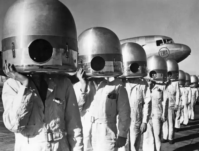 16. Нет, это не марсиане, а механики TWA и инспекторы присутствуют при испытании самолёта.