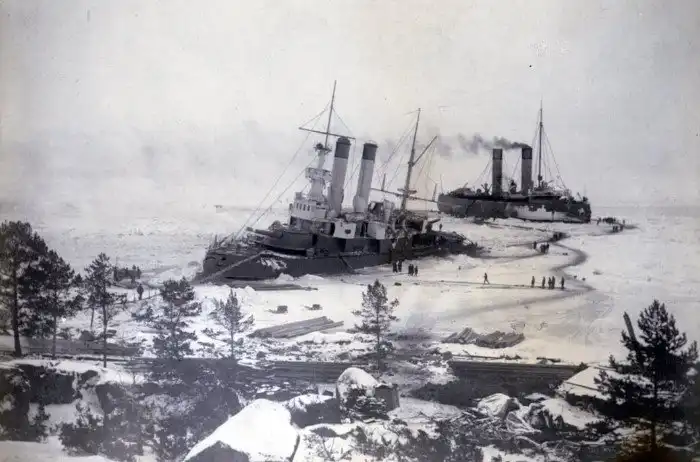 32. Ледокол «Ермак» спасает броненосец «Генерал–адмирал Апраксин» из ледового плена, 1899 год, Финский залив