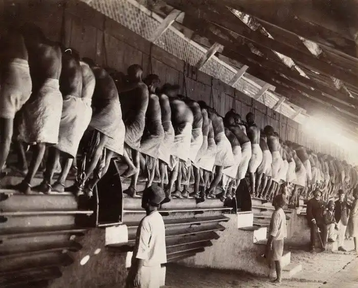 6. Прикованные наручниками заключенные вращают ногами валы мельниц в тюрьме Янгуна (Мьянма). 1900 г.