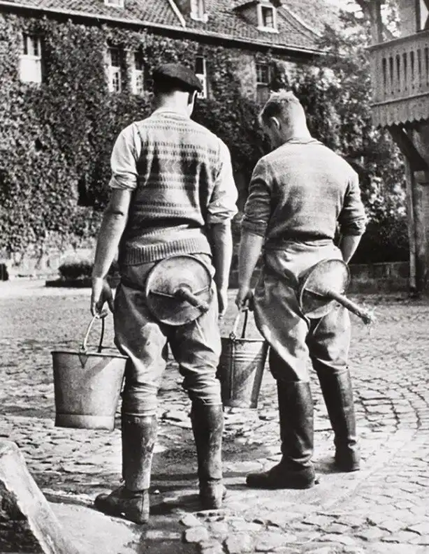 20. Студенты Сельхозинститута со стульями для дойки.Германия, Нойдек, 1934 год