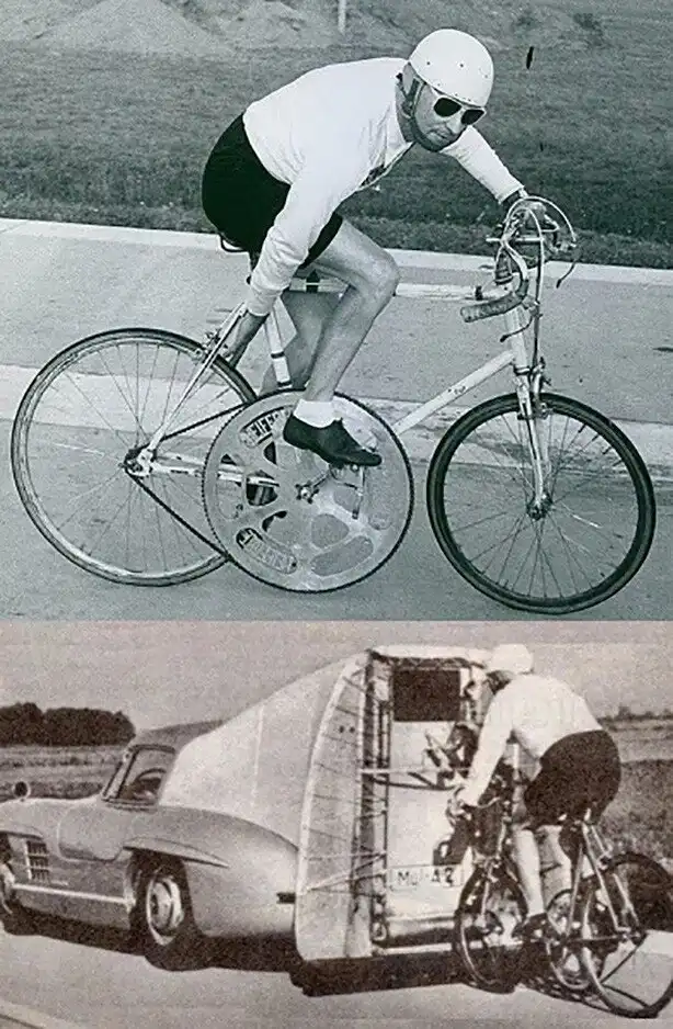 39. Жозе Мейффре и его легендарный велосипед, на котором он в 1962 году устоновил рекорд скорости. Разгоняясь в воздушном мешке позади Mercedes-Benz 300SL , велогонщик развил скорость 204,73 км /ч . Рекорд продержался 20 лет.