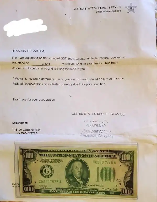 3. "У меня есть хрустящая 100-долларовая банкнота 1934 года вместе с письмом от Секретной службы с просьбой уничтожить ее"