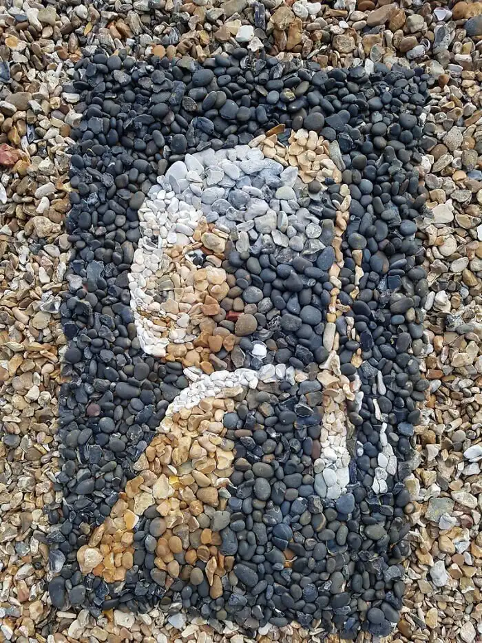 Британский художник Джастин Бейтман занимается ленд-артом: он "рисует" картины, выкладывая их из пляжной гальки разных цветов и размеров. Получается мозаика, на которую можно посмотреть только лично или на фотографии. Ведь живет такое творение очень недолго.