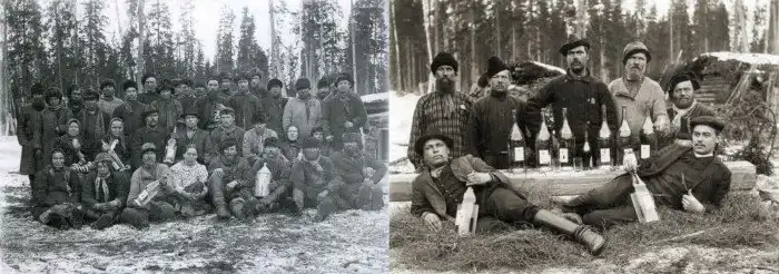 5. Автор этих двух снимков Ян Соберг, который потом стал одним из известнейших и востребованных фотографов Архангельска. Здесь он среди эстонцев, заготовлявших шпалы для строившейся железной дороги Вологда-Архангельск. Спиртное - премия за хорошую работ