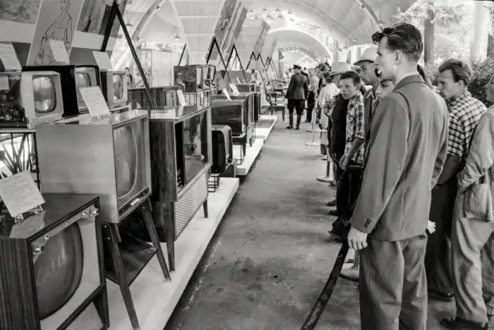 22. Москвичи рассматривают ассортимент советских телевизоров и радиоприемников представленных на временной выставке в Сокольниках, проходящей одновременно рядом с Американской национальной выставкой, Москва, 1959 год