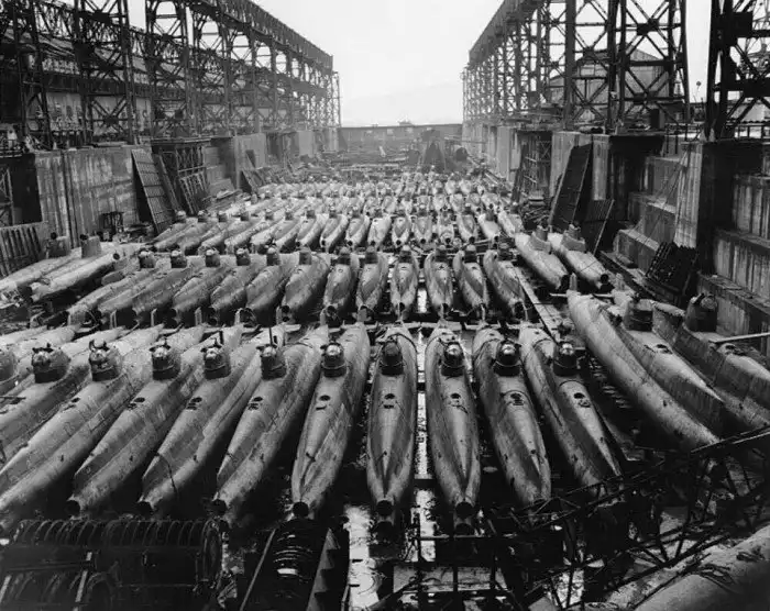 25. Японские подлодки типа D ("Koryu") Сверхмалые подводные лодки в частично затопленном доке на базе Курэ (англ.)русск., Япония, февраль 1946 года