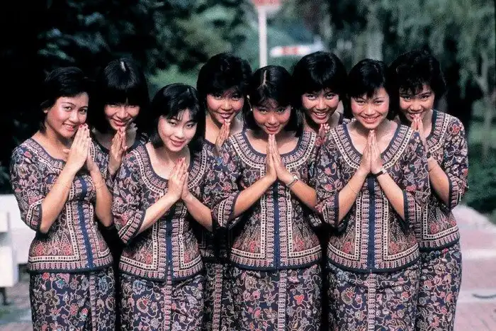 23. Стюардессы Singapore Airlines в пестрых саронгах, разработанных французским модельером Пьером Бальменом. 1968 г.
