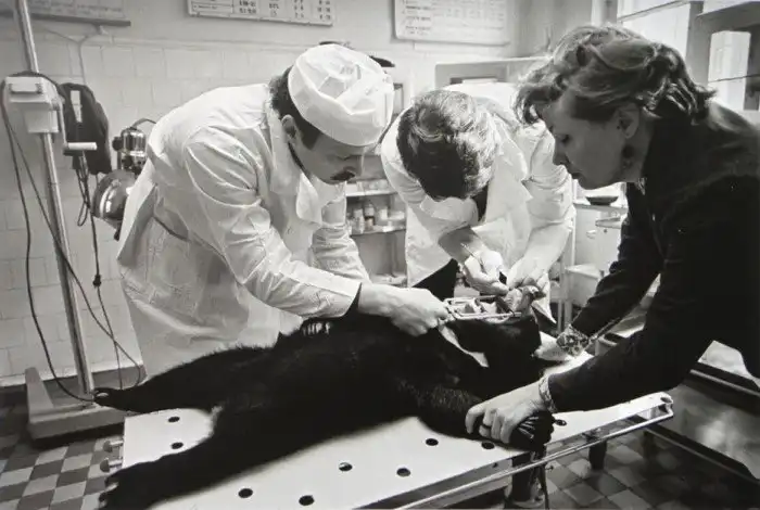 39. Сотрудники московского зоопарка лечат зубы малайскому медведю, 1970 г