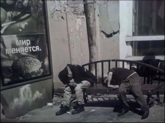 Сильно уставшие люди на лавочке у рекламного стенда МакДональдса. Россия. 1990-е.