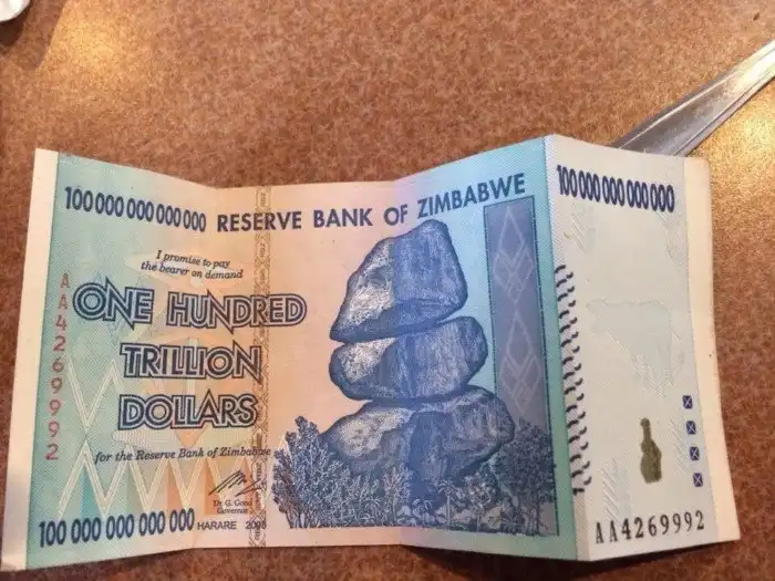 Купюра 100 триллионов долларов 2008 года из Зимбабве