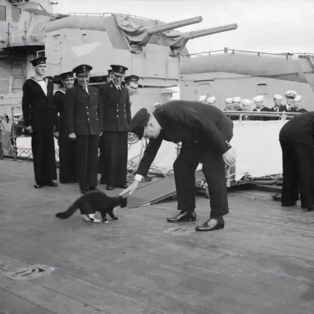 Уинстон Черчилль на борту линкора «Принц Уэльский» и талисман корабля, кот Блэки.
