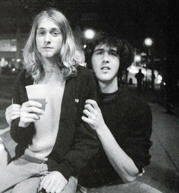22. Раритетное фото Курта Кобейна и Криста Новоселича из группы Nirvana после их первого выступления в Сиэтле, 1987 год