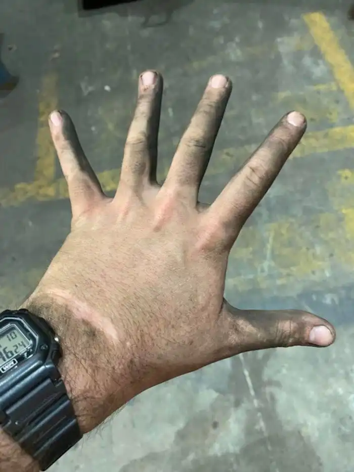 "После дня работы на сталелитейном заводе. Пыль покрыла всю мою руку, кроме шрама"