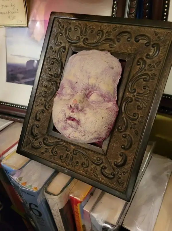 Лицо старинной куклы в рамочке — идеальный герой для фильма ужасов