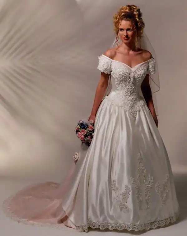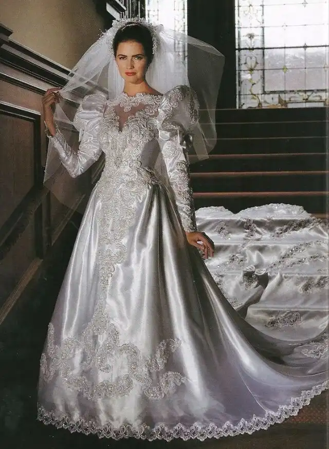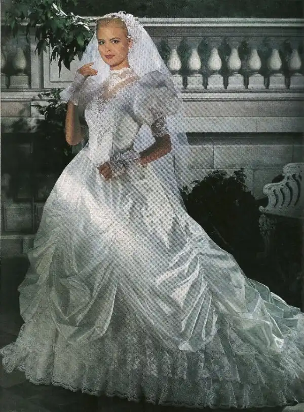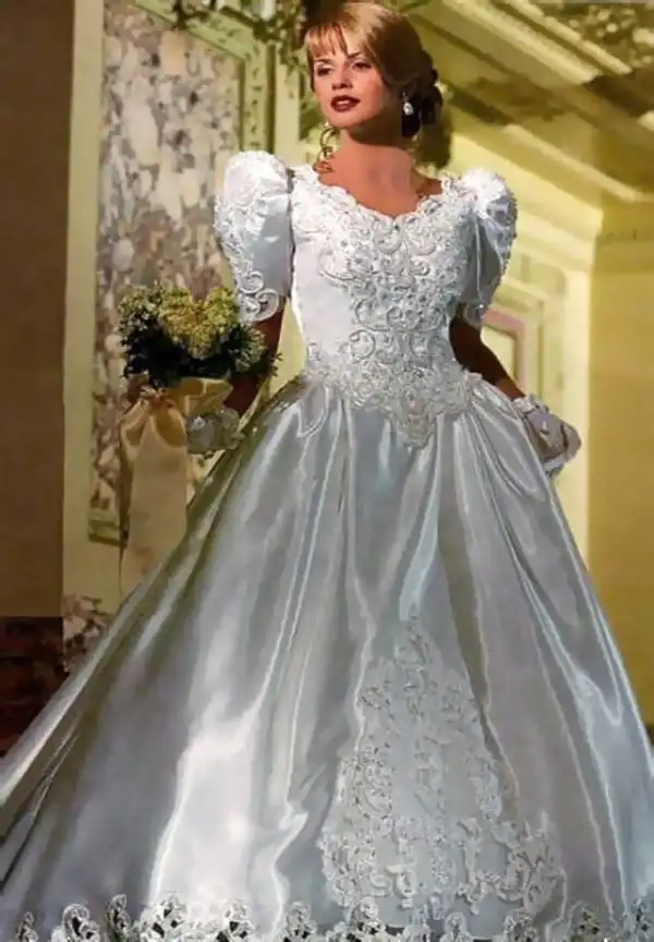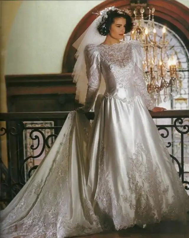 1990-е были эпохой, когда минималистичный дизайн постепенно начинал входить в моду, но свадебные платья все еще оставались очень торжественными и пышными, со множеством украшений, аппликаций, кружева и складок, многослойными юбками, блестящими тканями, шлейфами и непременной фатой.