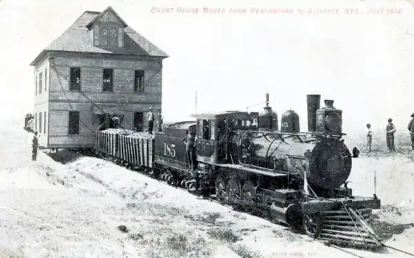 На фото запечатлено перемещение здания суда по железной дороге, Небраска, США, 1899 год