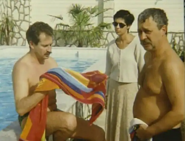 5. Владислав Листьев со своей супругой Альбиной Назимовой и Леонидом Якубовичем на отдыхе за границей, начало 1990-х
