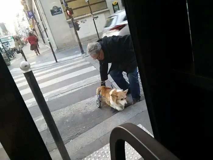 Мужчина помогает своему корги с парализованными лапами забраться на бордюр