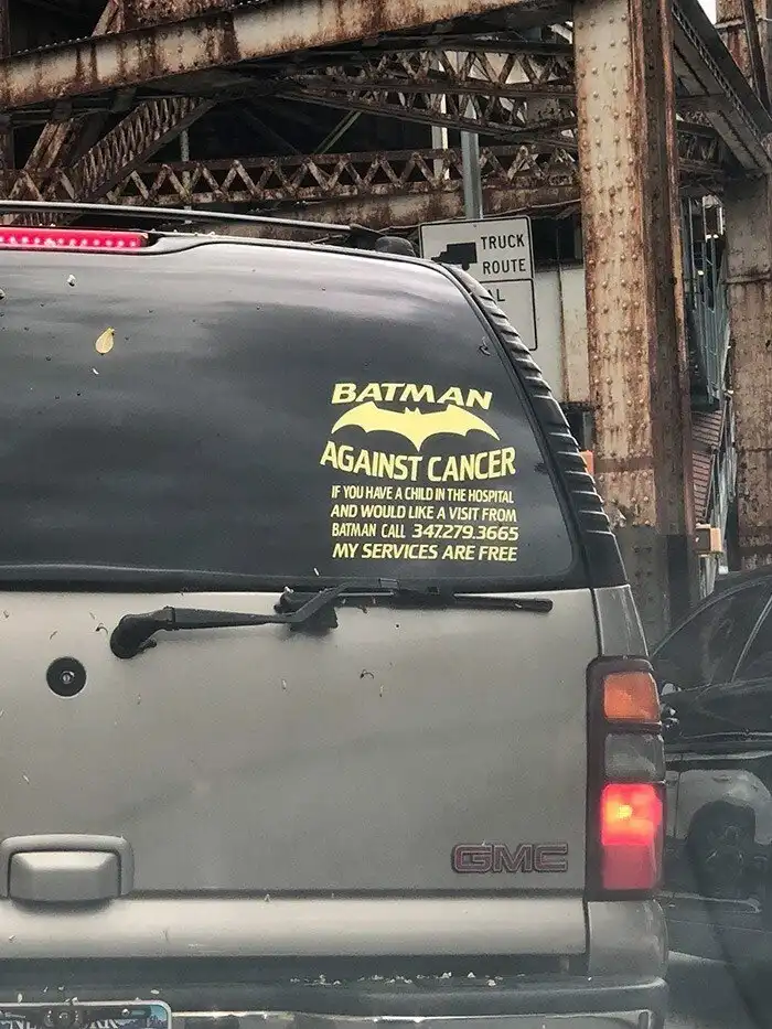 "Бэтмен против рака. Если ваш ребенок лежит в больнице, и вы хотите организовать ему визит Бэтмена, позвоните мне. Мои услуги бесплатны"