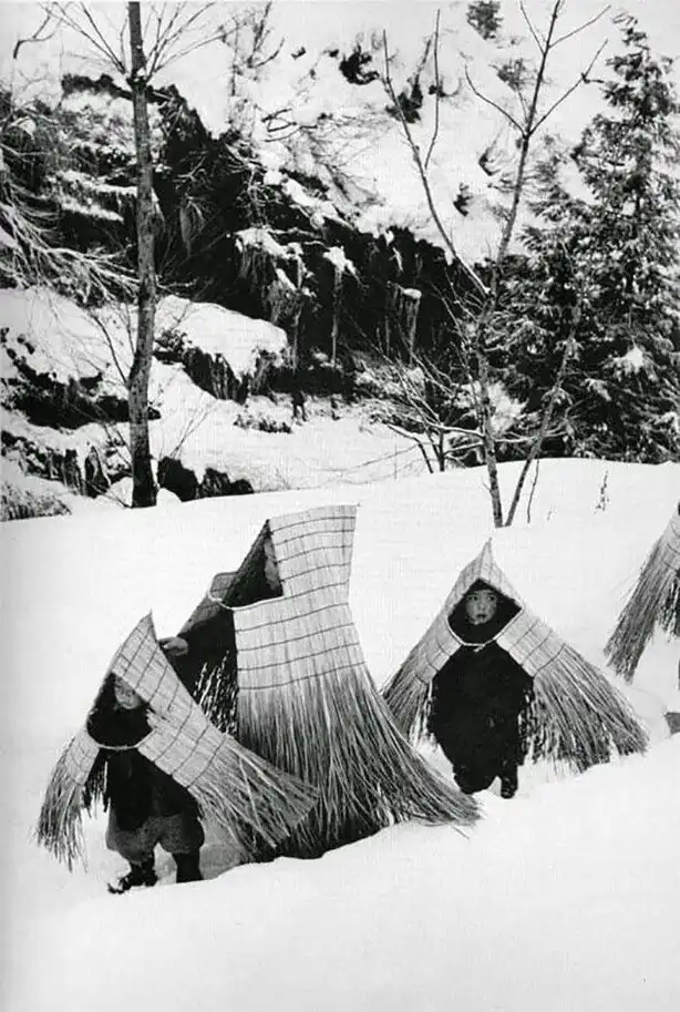 8. Дети с соломенными накидками для защиты от непогоды. Ниигата, Япония, 1956 год