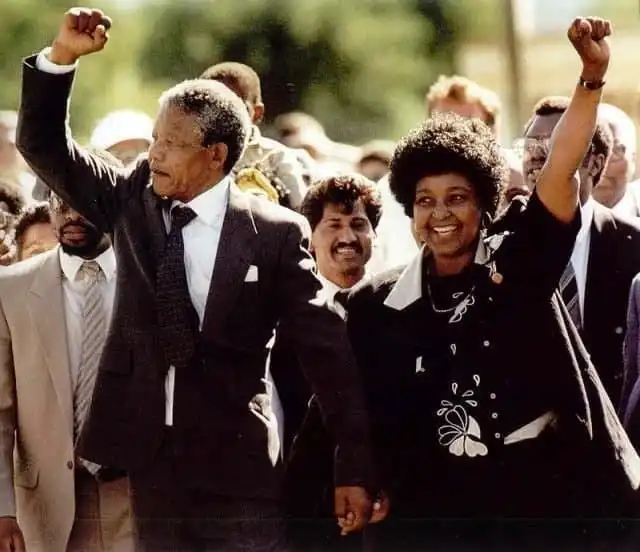 Нельсон Мандела со своей женой Винни празднуют триумфальное освобождение после 27-летнего заключения, 11 февраля 1990 год.