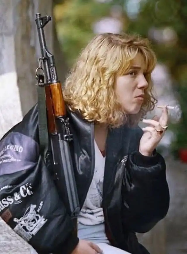 Боснийская девушка с АК-47, курит сигарету, ожидая похоронной службы на кладбище, Сараево, 14 сентября 1992 года.
